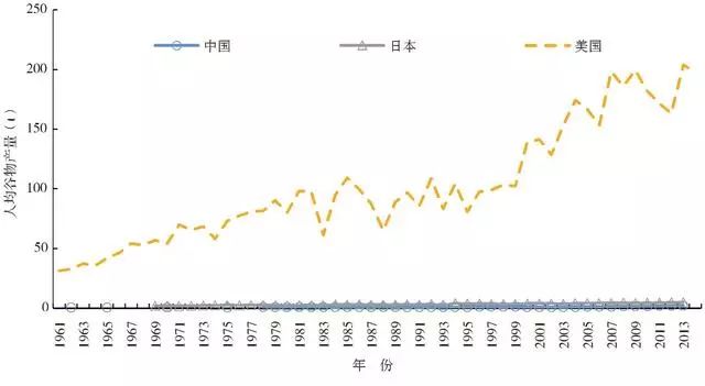 图1.1961—2013年3国人均谷物产量变化