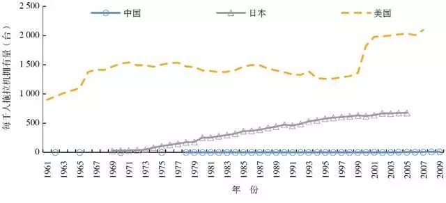 图3.1961—2009年3国人均拖拉机拥有量